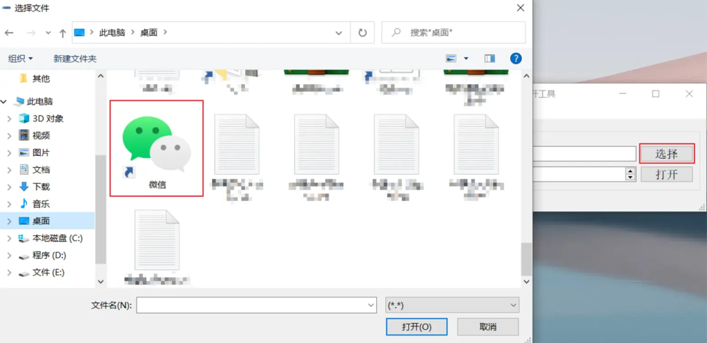 2.点击“选择”按钮,选择桌面微信图标(如果桌面没有微信图标,将微信安装路径直接复制进“微信路径”后的输入框即可)