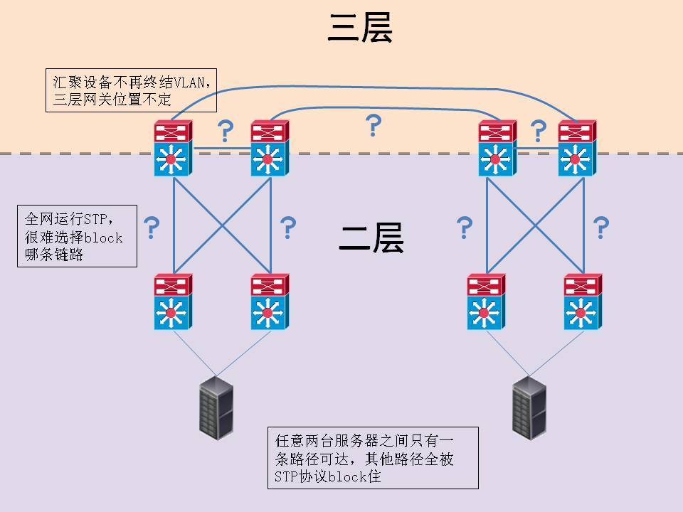未来数据中心内部的横向流量将越来越大,新加入的设备同原有设备之间仍然要运行STP,如果两台服务器之间只有一条链路可行,其余的万兆交换机端口全被block,不但是投资的极大浪费,也无法支持业务的快速扩展;其次,当交叉链路数量增加时,二层网络的设计会变得非常复杂,哪条链路该保留哪条链路该阻断?三层网关设在何处?类似这样的问题会冒出一大堆,这就失去二层网络配置简单的优势;最后,传统的二层MAC地址没有层次化的概念,同一个二层网络内的接入交换机上存储本网段所有设备的MAC地址,这很容易导致边缘设备的MAC地址空间耗尽,特别是在虚拟化的数据中心内,虚拟机的MAC地址数量可能以千计。