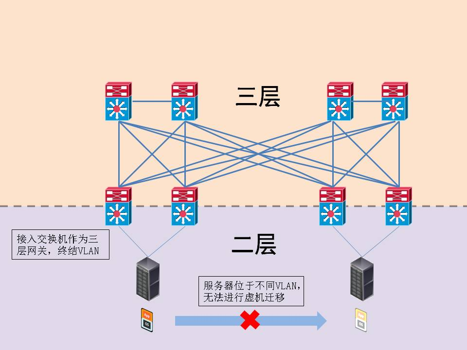 如果二层互联不能解决问题,另一种思路是在汇聚交换机和接入交换机上设置IP网关,通过三层路由将所有交换机连接起来,类似的解决方案还包括将网关设置在核心设备上,通过核心设备集中互联。这个做法以前也许勉强可行,但在虚拟化环境中,二层网络是虚拟机迁移的基础。虚拟化的最大特点是可以将业务动态部署到数据中心的任何计算资源上,如果这些计算资源(也就是服务器)被过多的三层网关隔离开来,也就失去了虚拟化的优势。