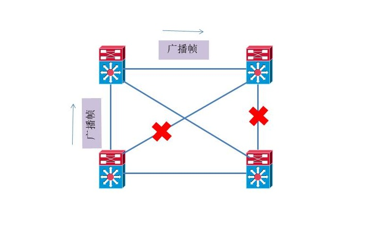 为了解决这个问题,交换机厂商引入了STP。STP的机制也极其简单,就是通过阻断二层端口来防止环路,并阻止数据帧从其接收到的端口再转发出去。