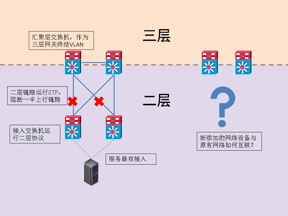 今天的大部分数据中心网络是遵循标准的层次化理念建设的,分为接入层和汇聚/核心层,接入层和汇聚层之间为二层链路,三层网关设在汇聚或核心,所有的二层链路上都运行生成树协议(STP),当任意两点间有一条以上路径可达时,STP会block多余的路径,以保证两点间只有一条路径可达,从而防止环路的产生。这种模式在过去很长一段时间被大规模采用,因为其部署起来非常简单,接入层设备不需要复杂的配置,大部分的网络策略只要在汇聚层集中部署就能分发到全网。但随着数据中心的规模不断扩张,这种模型逐渐显得力不从心。